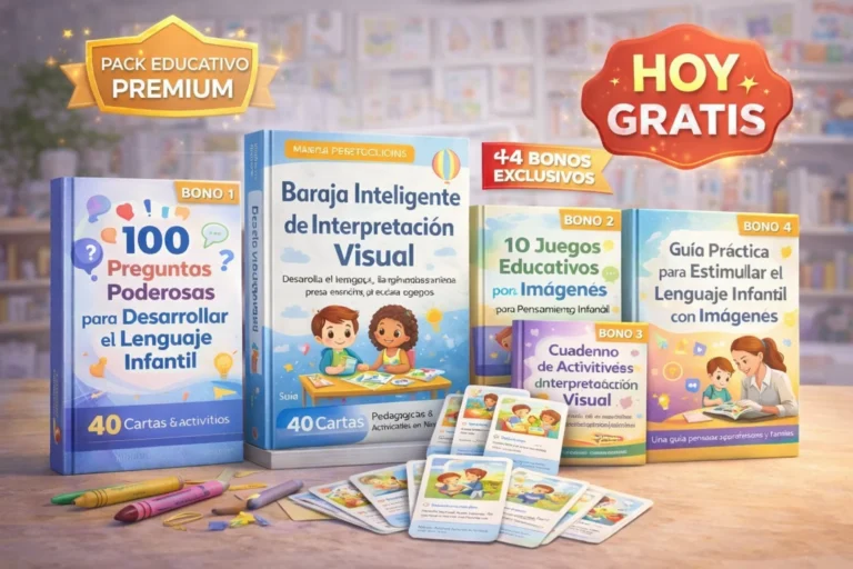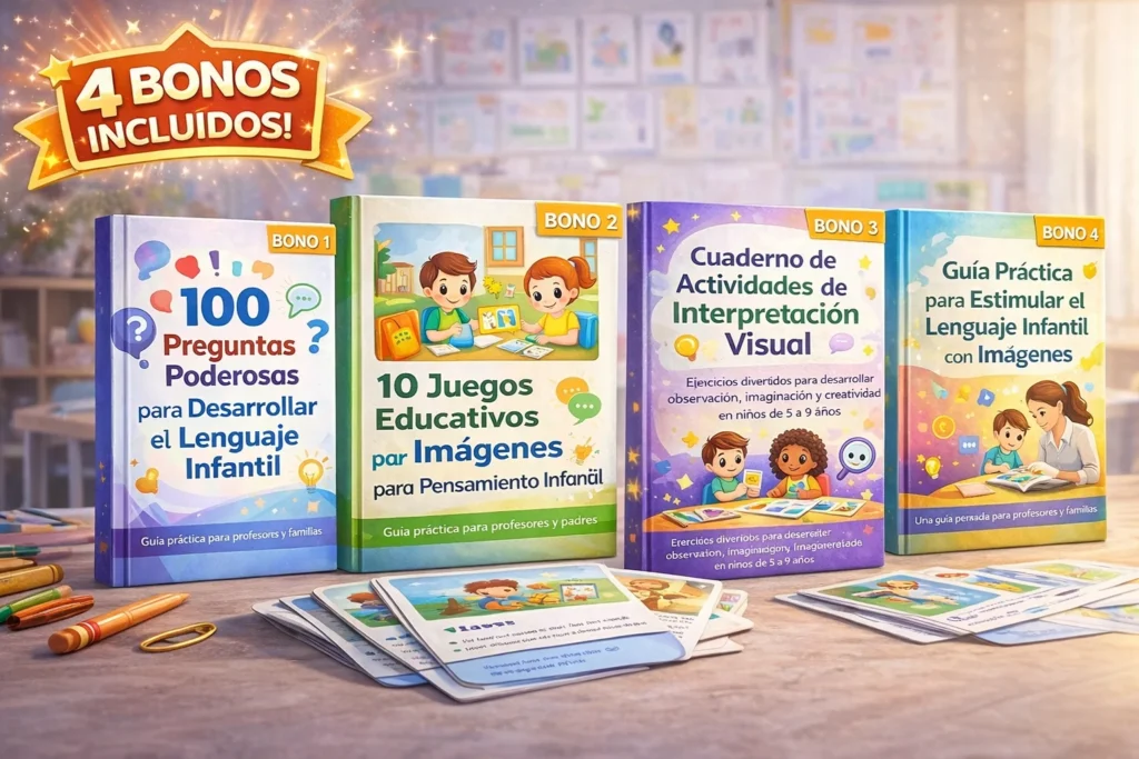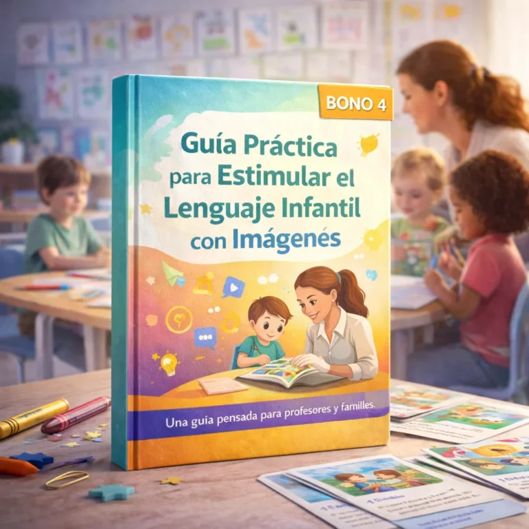BONO 4 - Guía Práctica para Estimular el Lenguaje Infantil con ImágenesUna Guía Práctica para Estimular el Lenguaje Infantil con Imágenes, diseñada para profesores y familias que desean desarrollar el vocabulario, la creatividad y la comunicación de los niños de forma natural. Incluye estrategias, preguntas poderosas y actividades fáciles para aplicar tanto en el aula como en casa