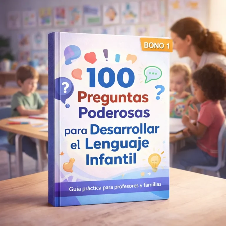BONO 1 - 100 Preguntas Poderosas para Desarrollar el Lenguaje InfantilUna guía práctica con 100 preguntas poderosas diseñadas para estimular el lenguaje, la imaginación y la expresión verbal en niños. A través de preguntas sobre imágenes, emociones, situaciones cotidianas y creatividad, profesores y familias pueden fomentar conversaciones significativas que fortalecen el vocabulario, la confianza y el pensamiento infantil.